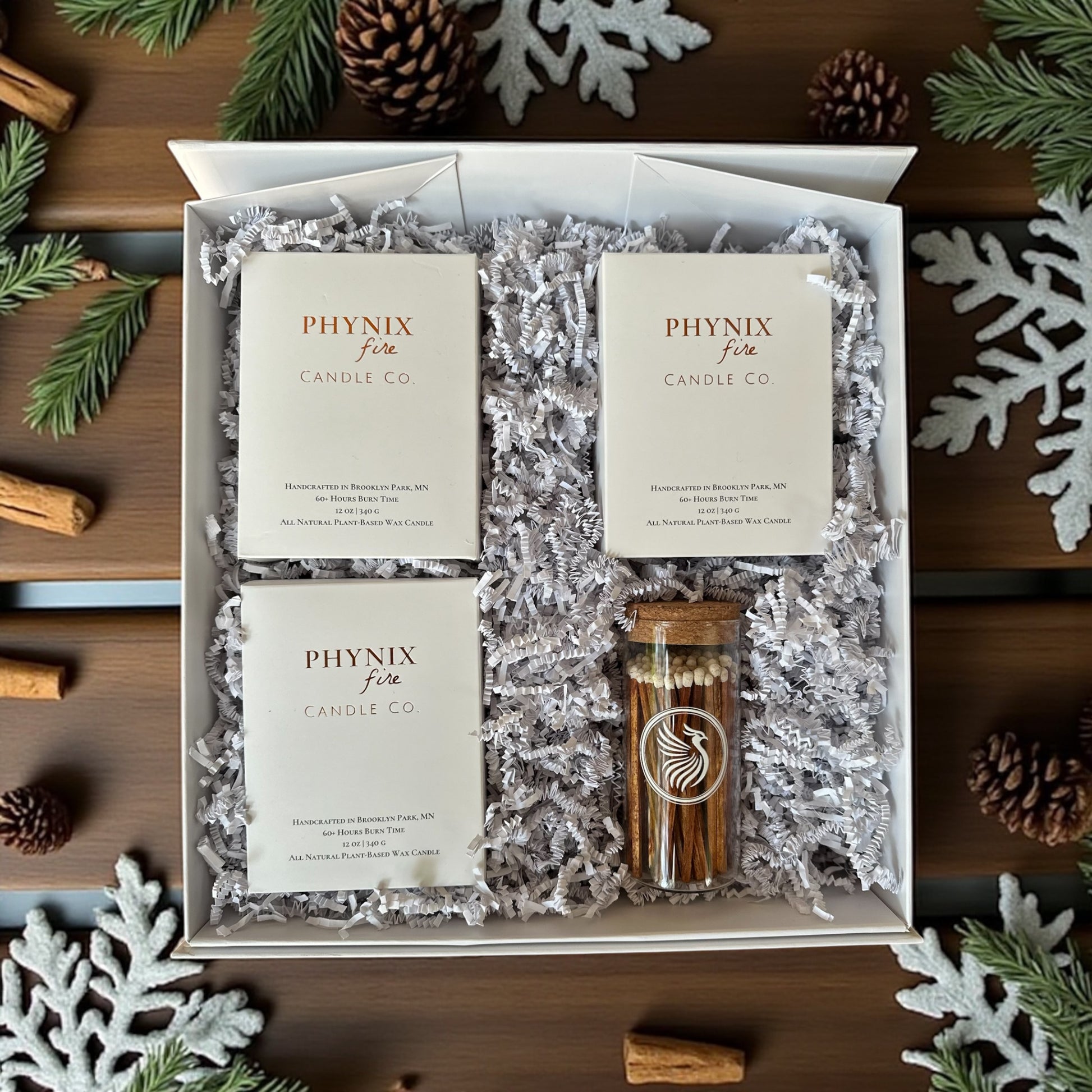 This trio features three of our new ornament candles, each crafted to be as enchanting as the aurora itself, paired with a chic container of 50 matches with a striker on the bottom. Perfect for gifting or indulging in your own self-care rituals.